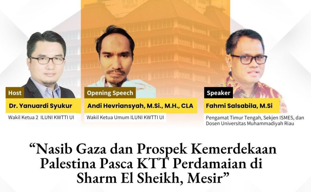 Ikatan Alumni Universitas Indonesia Kajian Wilayah Timur Tengah dan Islam (ILUNI UI KWTTI) kembali menggelar Middle East Update #2 dengan tema “Nasib Gaza dan Prospek Kemerdekaan Palestina Pasca KTT Perdamaian di Sharm El Sheikh, Mesir.” Kegiatan ini dilaksanakan pada Rabu, 22 Oktober 2025 pukul 19.30–20.30 WIB melalui forum daring.